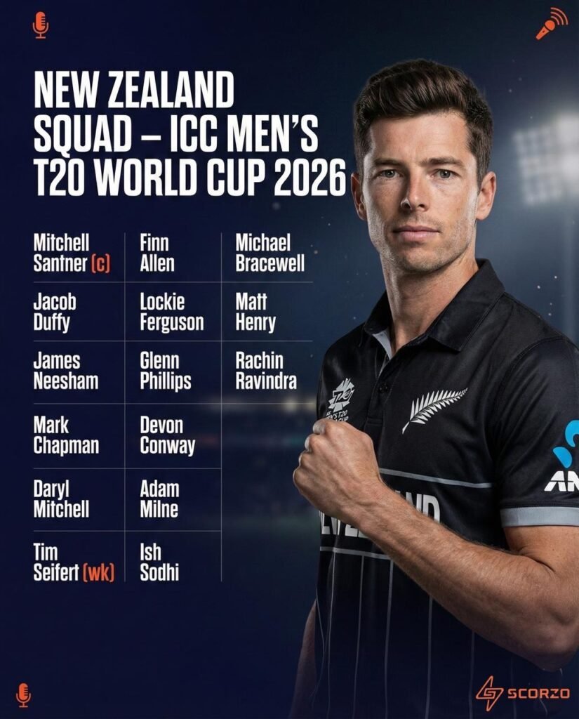 New Zealand Cricket (NZC) have officially announced their 15-member squad for the ICC Men’s T20 World Cup 2026, set to be played in India and Sri Lanka from February 7. The squad reflects a clear conditions-based approach, with a strong emphasis on spin and all-round depth for subcontinental pitches.
